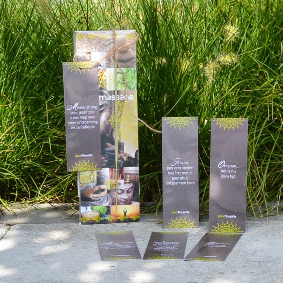 De PUUR filosofie cadeaulabels worden vaak gecombineerd met het filosofiespel, de spreukkaarten, of zoals op de foto weergegeven in combinatie met de PUUR massage cadeaubon. (PUUR filosofie is een onderdeel van PUUR massage) Meer informatie over de filosofie spelkaarten klik hier. Voor de spreukkaarten klikt u hier.